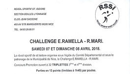Les samedi 07 et dimanche 08 avril 2018, le Réveil Sportif Saint Isidore organise le challenge Ramella - Mari, disputé en 32 triples, 3 et 4èmes divisions, par poules