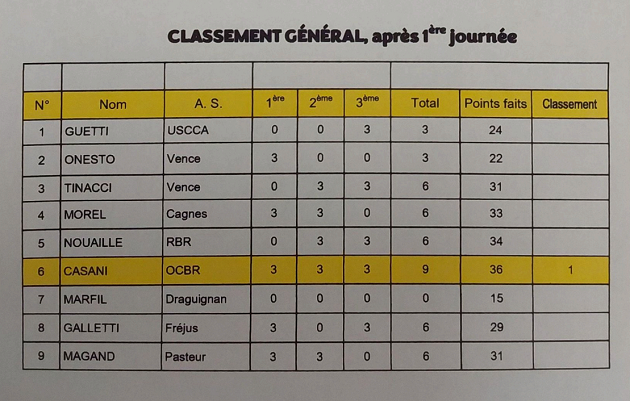 victoires des Résolus Bois Roulant à Fréjus. Le club niçois se repositionne au classement général avec six points, à égalité de points avec quatre autres formations.La première place est occupée par Christian Casani (OC Baus Roux) avec neuf points.